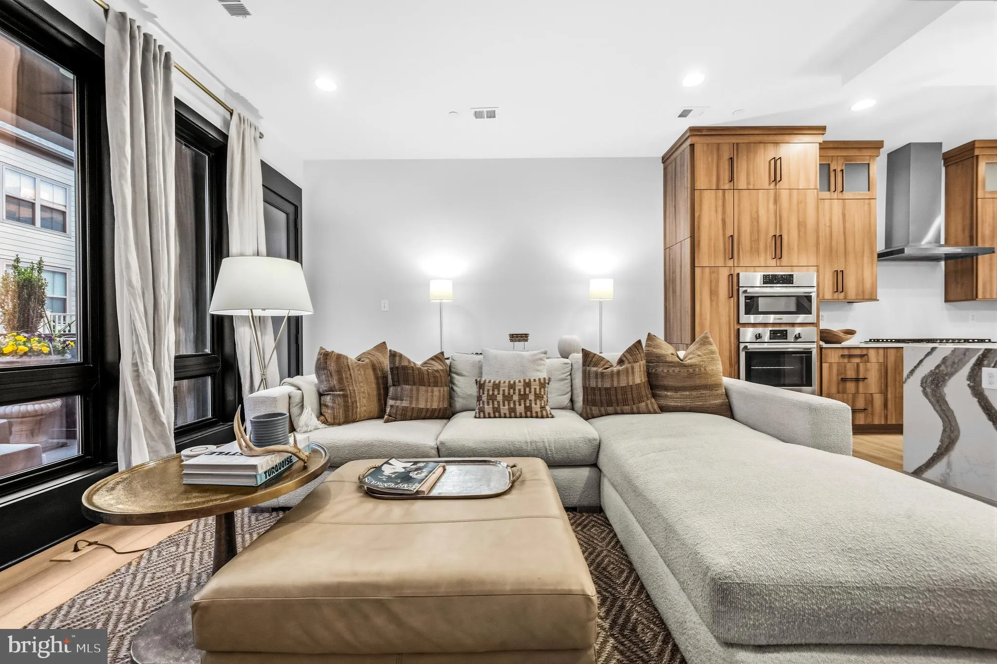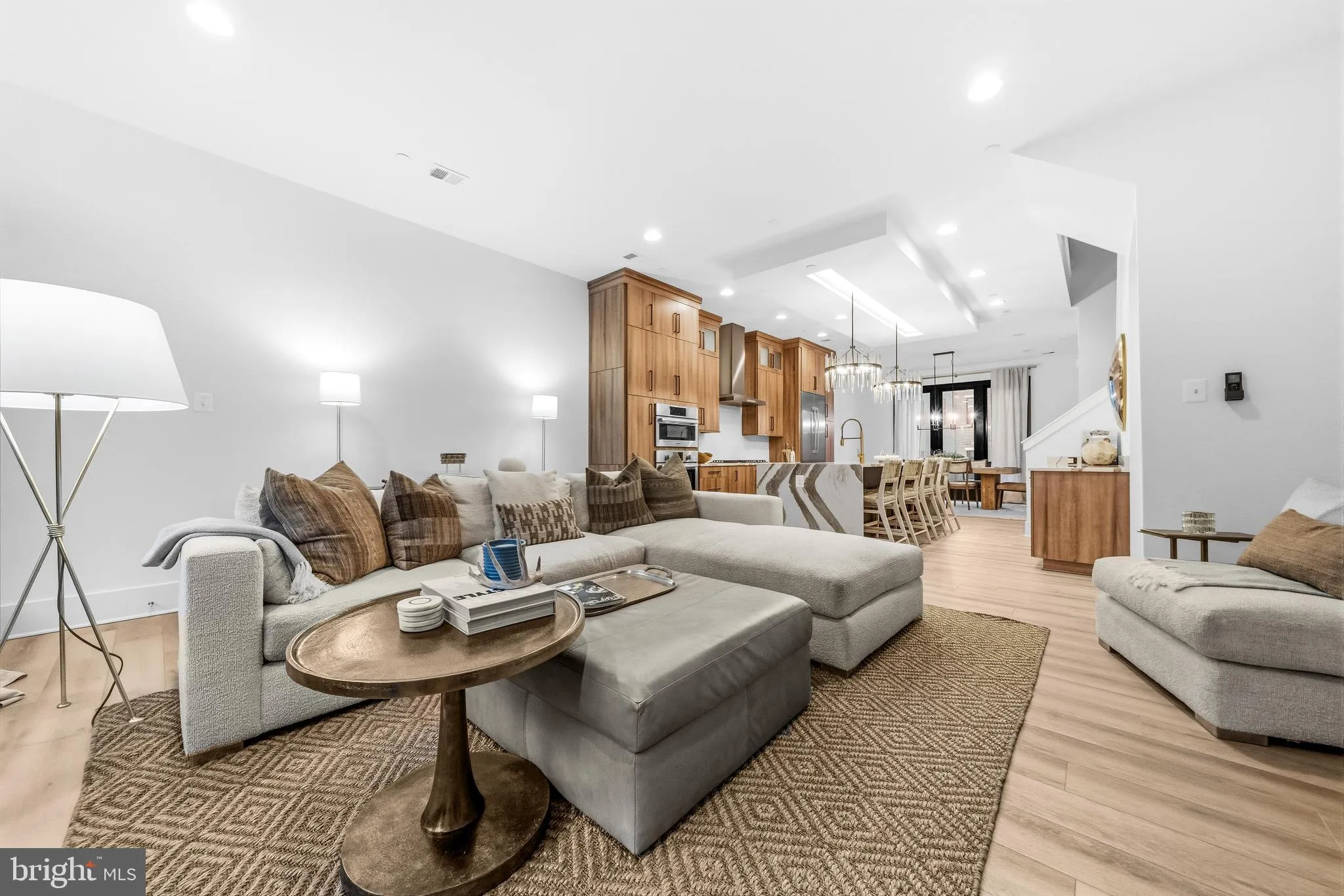 The gourmet kitchen is designed to impress, featuring premium Bosch appliances, upgraded cabinetry, sleek countertops, and an oversized quartz island that anchors the space. A custom-built bar enhances both functionality and style—ideal for entertaining or everyday living.