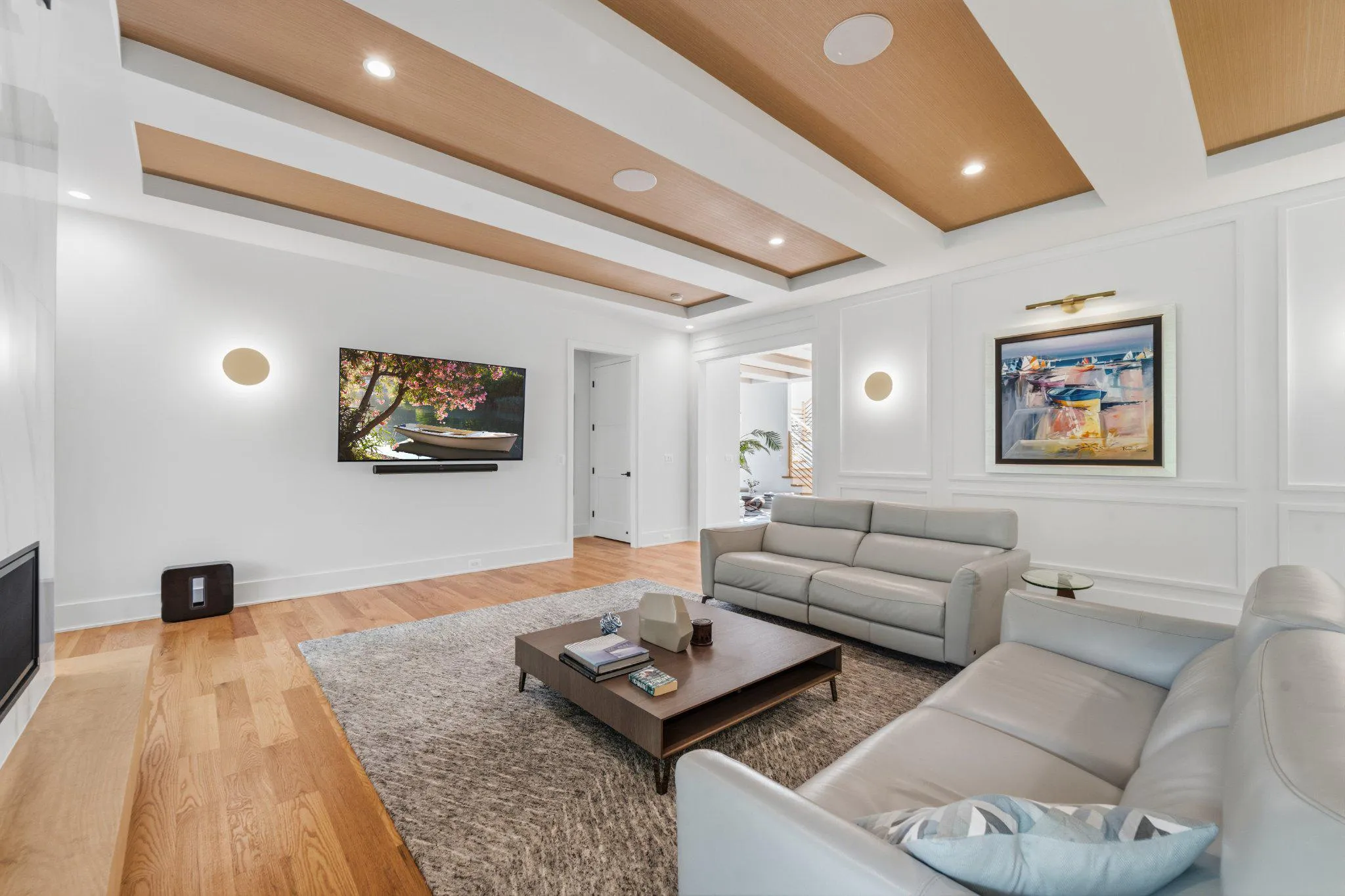 The lower level is an entertainer’s paradise, complete with 9-foot ceilings, a sprawling recreation room with a grand wet bar, a state-of-the-art gym, and a theater room prepped for a golf simulator. A private in-law suite with a full bath ensures guest comfort, while advanced home technology elevates the living experience.