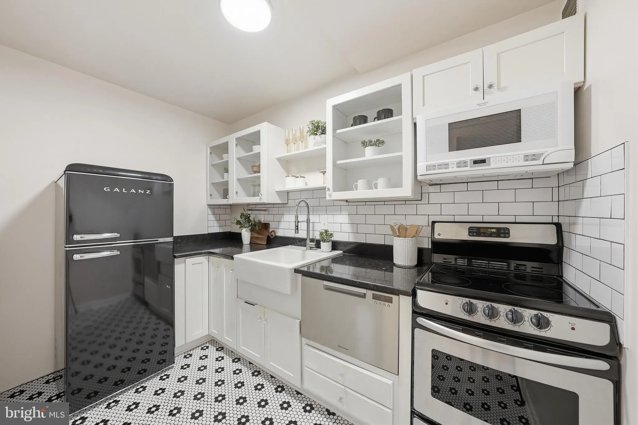 The recently refreshed kitchen blends classic style with thoughtful updates, featuring a new retro-style refrigerator, subway-tile backsplash, and new tile flooring. Updated cabinetry and fixtures complement the space, delivering both function and aesthetic appeal.