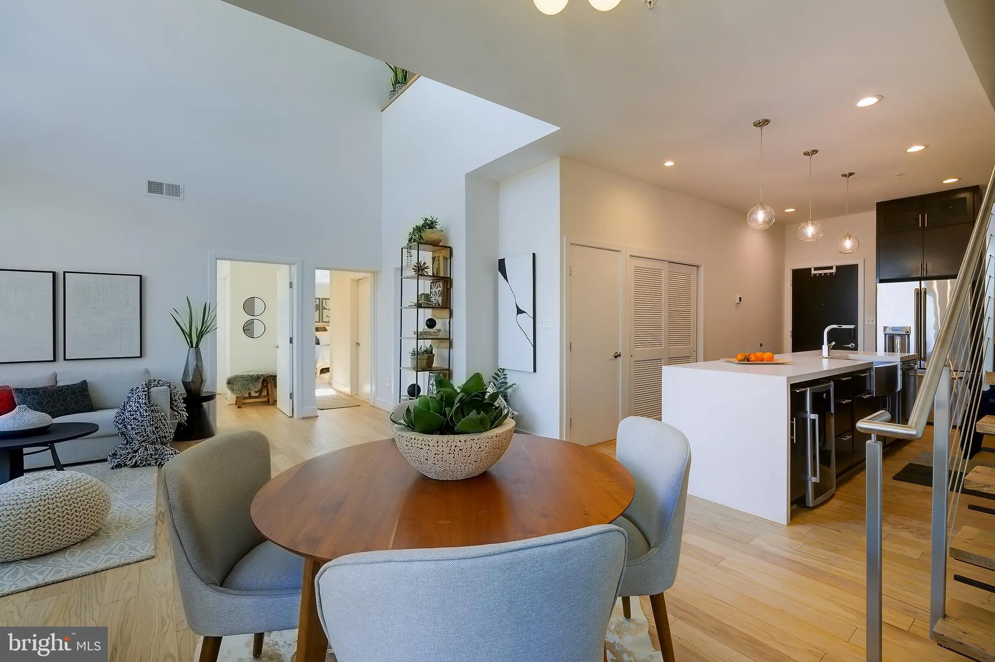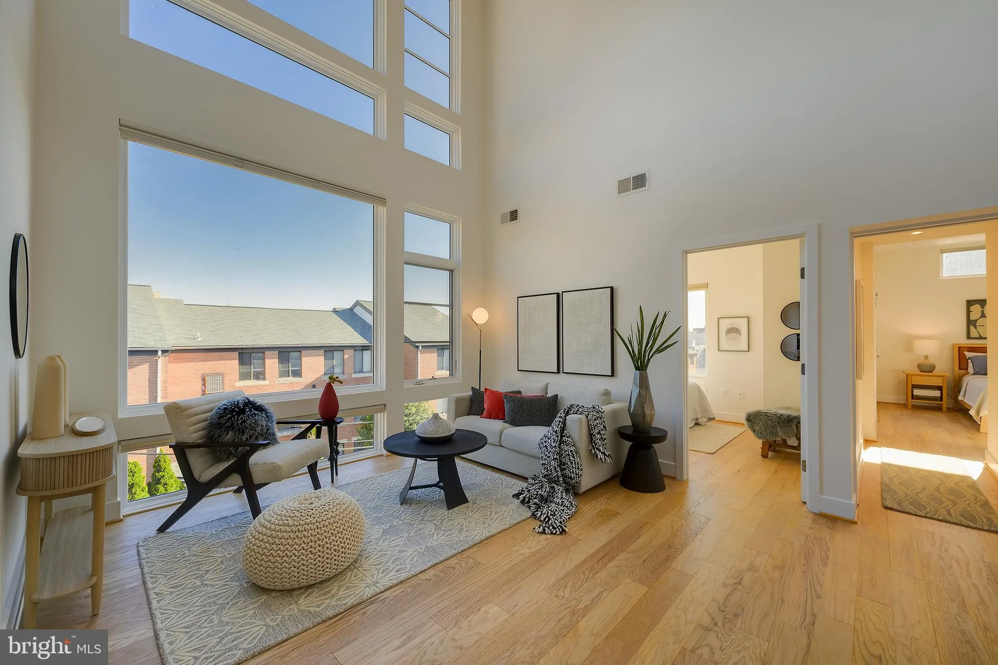 Penthouse-style living at 1443 Chapin St NW #404 offers a dramatic, light-filled top-floor residence nestled between the U Street Corridor, Adams Morgan, and Columbia Heights on a quiet, block-long street next to Meridian Hill Park. Spanning 1,421 square feet, this spacious two-bedroom, two-bathroom plus loft condo combines volume, light, and flexibility, anchored by a stunning two-story living room with a full wall of windows that flood the space with natural light and create a rare sense of scale. The open-concept living and dining area flows seamlessly beneath soaring ceilings, complemented by recently refinished hardwood floors that add warmth and sophistication throughout. The kitchen features quartz countertops, ample cabinetry, and quality appliances, providing a clean, modern space suited for both everyday living and entertaining.