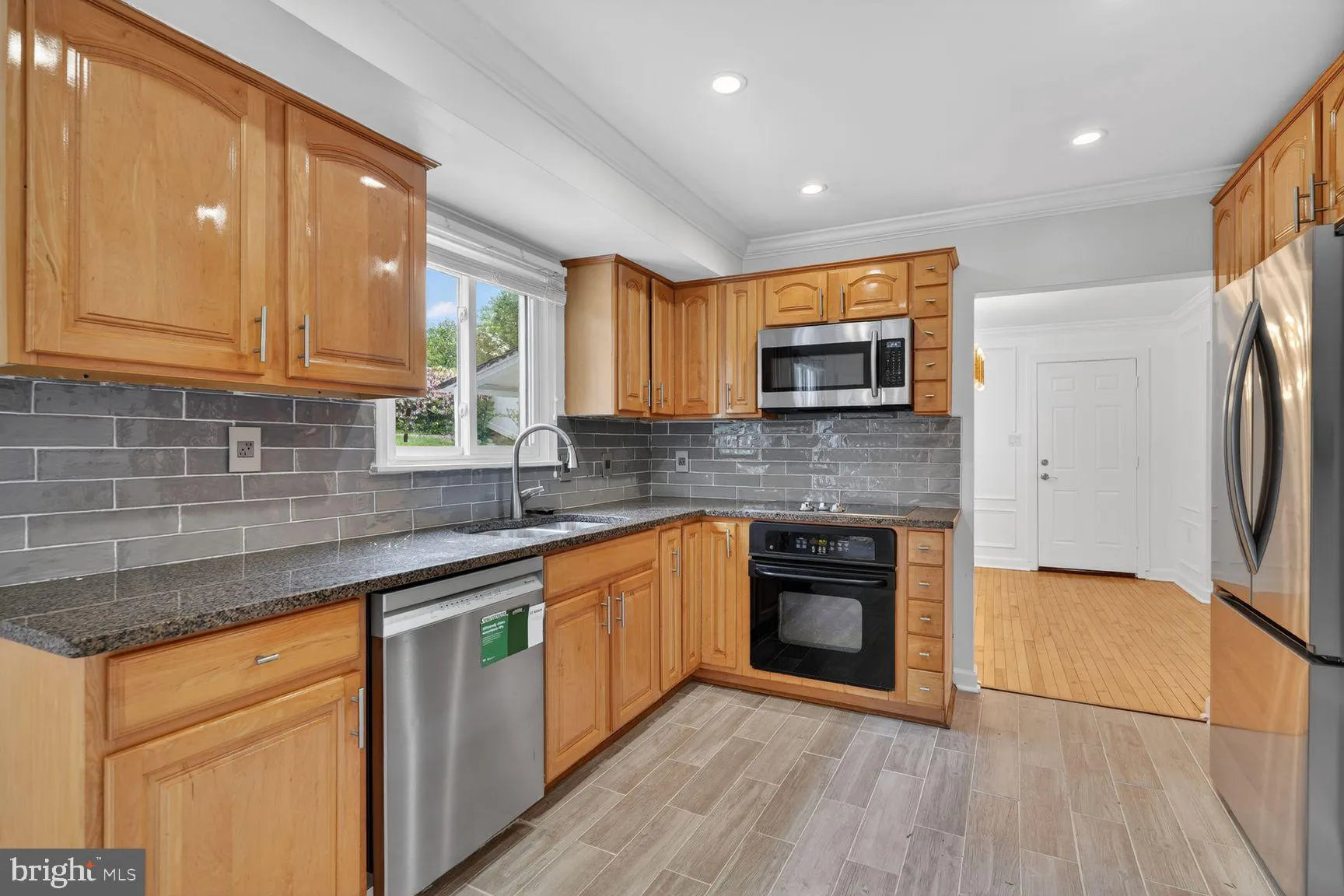 The kitchen has been enhanced with a brand-new backsplash, stainless steel appliances including a modern three-door refrigerator and dishwasher, and elegant porcelain tile flooring that extends seamlessly to the main entrance, creating a warm and inviting first impression.