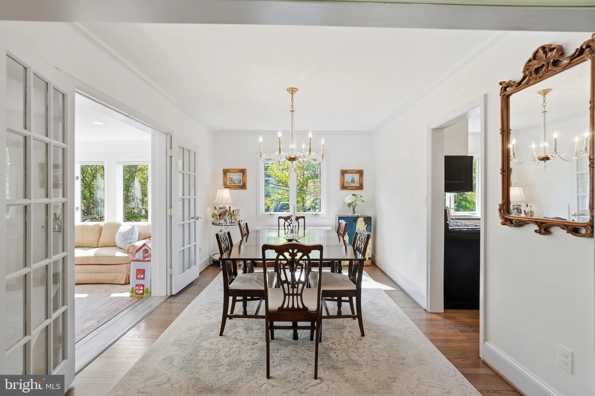 The sunlit living room features a fireplace, crown molding, and a large picture window overlooking the rear gardens. A wide opening leads to the formal dining room with a new chandelier, while French doors open to a bright, year-round sunroom with windows on three sides and access to the patio. The eat-in kitchen offers white cabinetry, granite countertops, stainless steel appliances, and updated hardware.