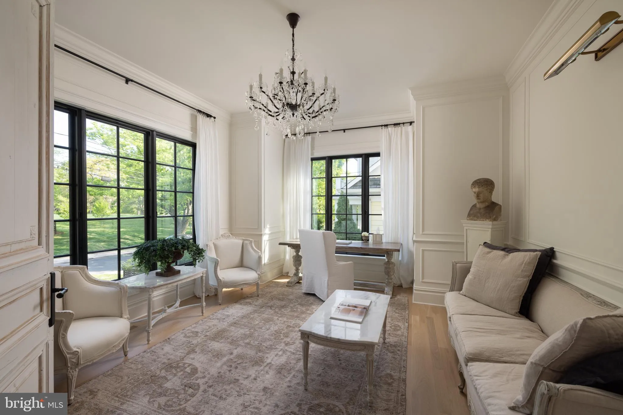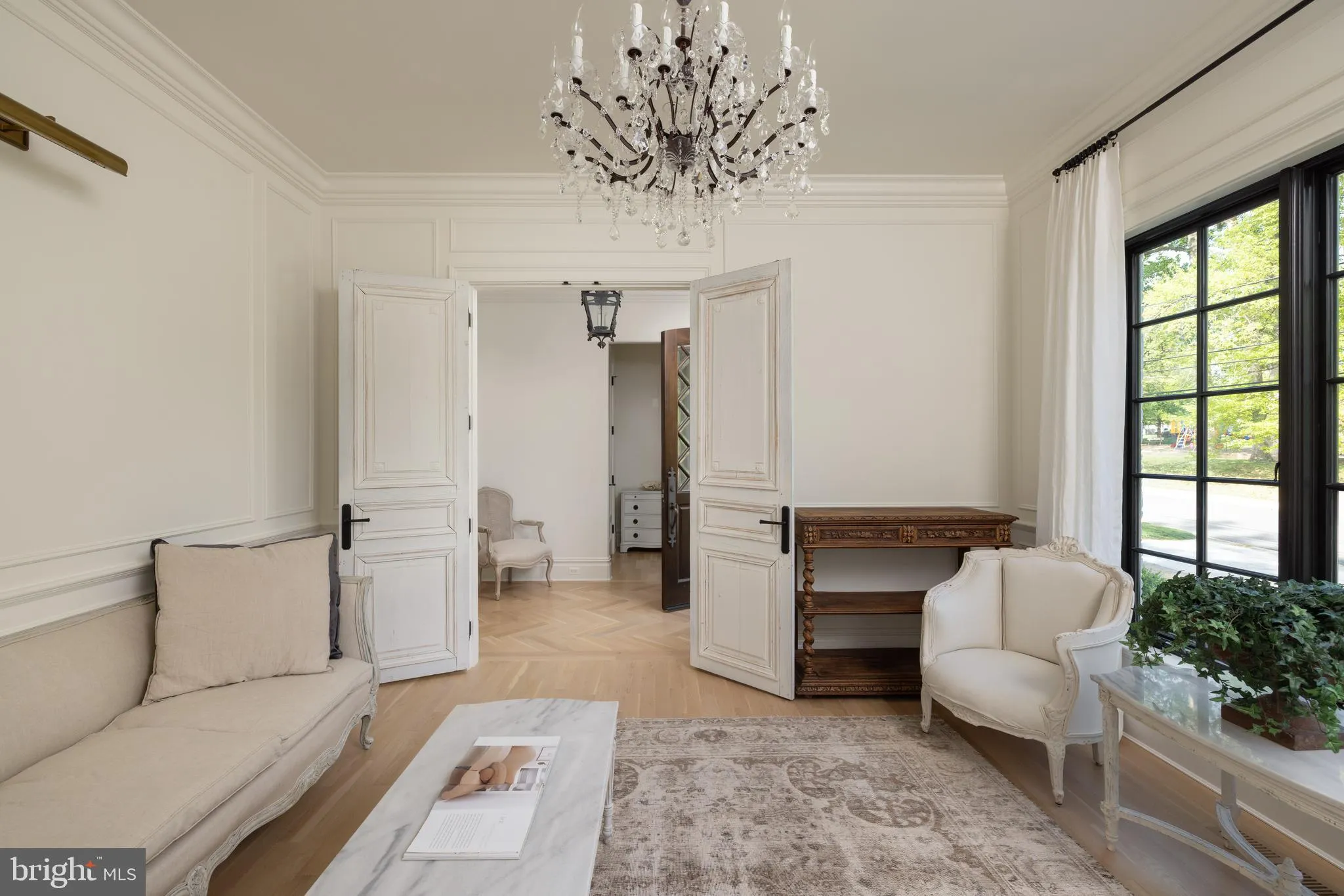 A gracious entry foyer with herringbone hardwood flooring and bespoke millwork sets the tone, opening to a main level designed for both elegant entertaining and everyday living. At its center, the chef’s kitchen is a true showpiece—appointed with a 60” dual-fuel Wolf range with integrated griddle, dual Sub-Zero refrigeration, double dishwashers, Waterworks fixtures, a dedicated filtered water system, and a suite of Miele appliances. Marble surfaces, custom cabinetry, and a statement island flow seamlessly into sun-filled living and dining spaces, enhanced by a wood-beamed ceiling, limestone fireplace and bespoke wood shutters. A tailored mudroom with floor-to-ceiling millwork, walk-in pantry, and direct access to the two-car garage with solid cedar insulated doors adds both beauty and functionality.