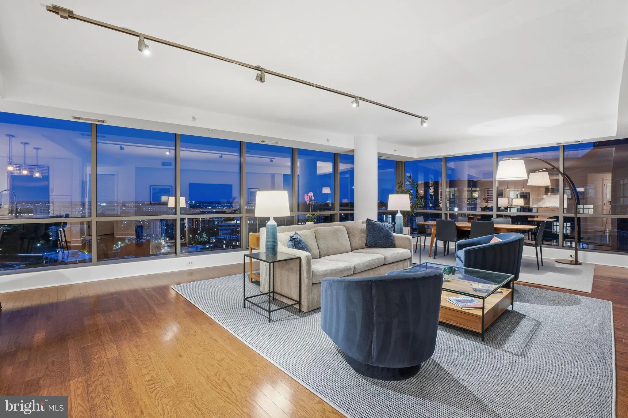 Renovated with gleaming hardwood floors and high-end finishes throughout the entire residence, an expansive living room is highlighted by floor-to-ceiling windows that wrap around the southeast corner of unit, providing an abundance of natural light and endless views of Arlington, DC, and beyond. Whether it is watching planes land at DCA or enjoying the 4th of July fireworks, the view is one-of-a-kind and the perfect setting for entertaining guests day or night.