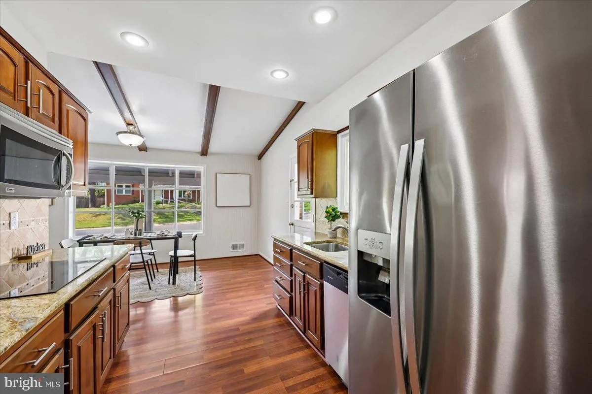Charming all-brick ranch on a quiet street in popular neighborhood of Kemp Mill in Silver Spring with 4 bedrooms, 3 bathrooms, and 2,820 square feet of well-designed living space. Freshly painted throughout and move-in ready. The main level features a wide, light-filled entryway that opens to a living room and dining room with beautiful hardwood floors throughout. The open concept flows naturally into a breakfast area with stunning beamed ceiling detail, and a kitchen with rich wood cabinetry, granite countertops, and stainless steel appliances. A large deck off the kitchen is perfect for outdoor dining and entertaining. Updated windows and doors bring in great natural light. The primary bedroom is a generous size with double closets, a built-in dresser, and a refurbished en-suite bath with beautiful tiles and vanity sink. Two additional bedrooms and a refurbished full hall bath complete the main level.