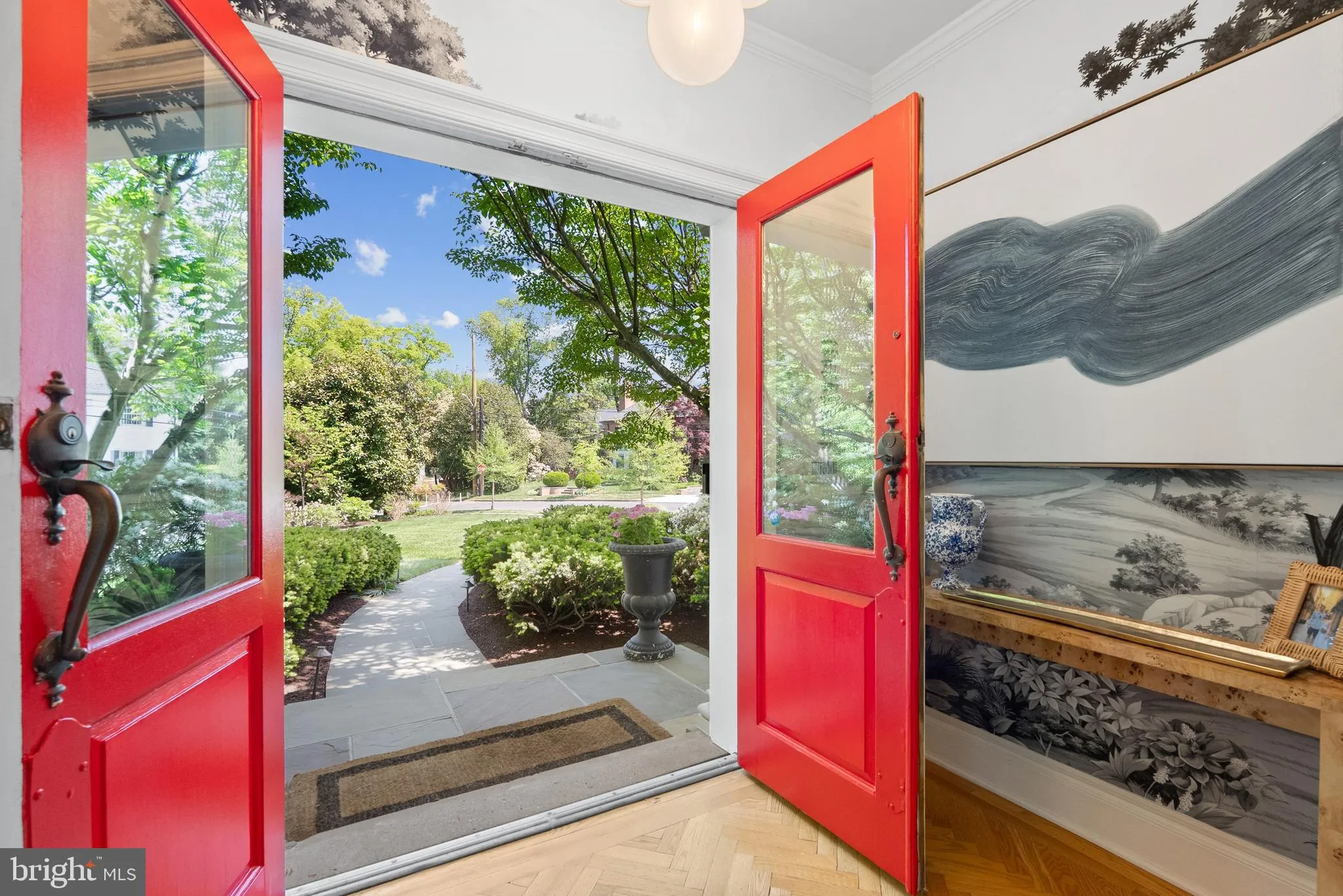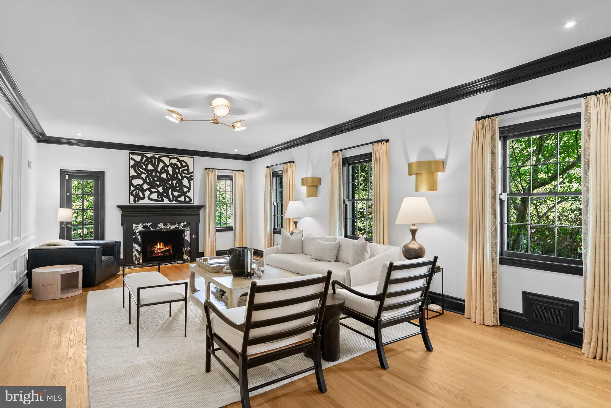 4925 Lowell Street, NW is an impeccably appointed brick Colonial that has been fully refreshed by Shannon Claire Interiors and offers refined, modern living across three finished levels. Charming double doors open into a dual‑height reception hall anchored by a dramatic serpentine‑style staircase, introducing an elegant tone for the home’s thoughtful layout. Distinct Living and Dining Rooms flank the main level and mirror one another with opposing fireplaces, dentil molding, and hardwood floors, creating a balanced, formal entertaining suite. The chef’s Kitchen is appointed with a La Cornue range, marble island & countertops, custom inset cabinetry, unlacquered brass finishes, and paneled appliances. A Breakfast Room with built‑in seating and a dedicated coffee/wet bar and the beamed Family Room anchored by built‑ins, both open to a wraparound deck and covered porch with stairs that lead to a southern‑facing rear garden. The upper level hosts a serene Primary Suite with two walk‑in closets and a luxurious en‑suite, plus two additional bedroom suites and two well‑proportioned bedrooms which share a hall bathroom. The walkout lower level expands living with a fireplace‑anchored Recreation Room, Gym, Guest Suite, ample storage, homework nook, and interior access to a discreet rear 2‑car garage.