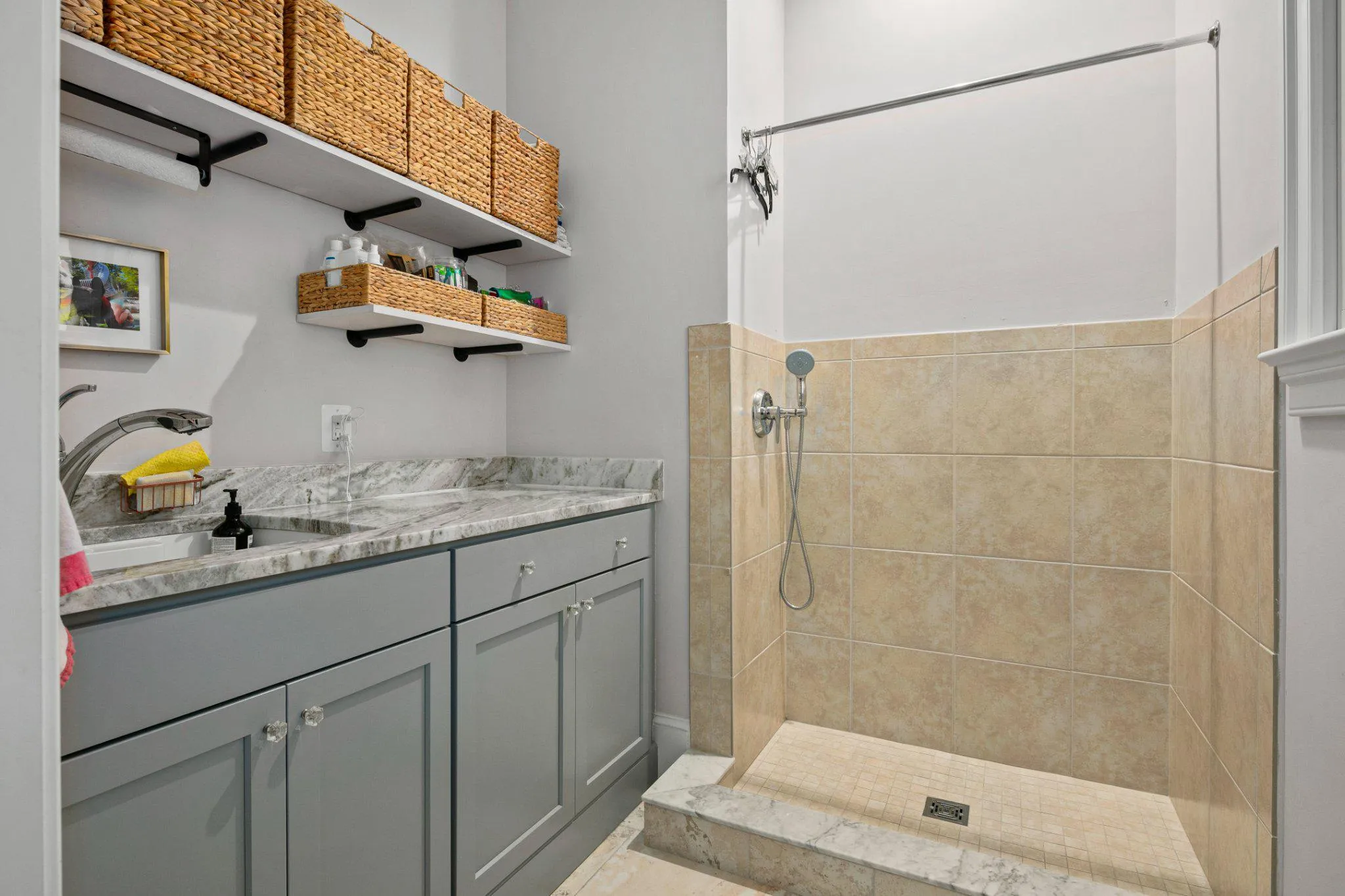 The lower level is equally well-appointed, with custom built-ins throughout. It includes a sound-insulated recreation room designed for music or media, a dedicated exercise room, a half bath, and a workshop with double-door access to the backyard, ideal for bikes and outdoor gear.