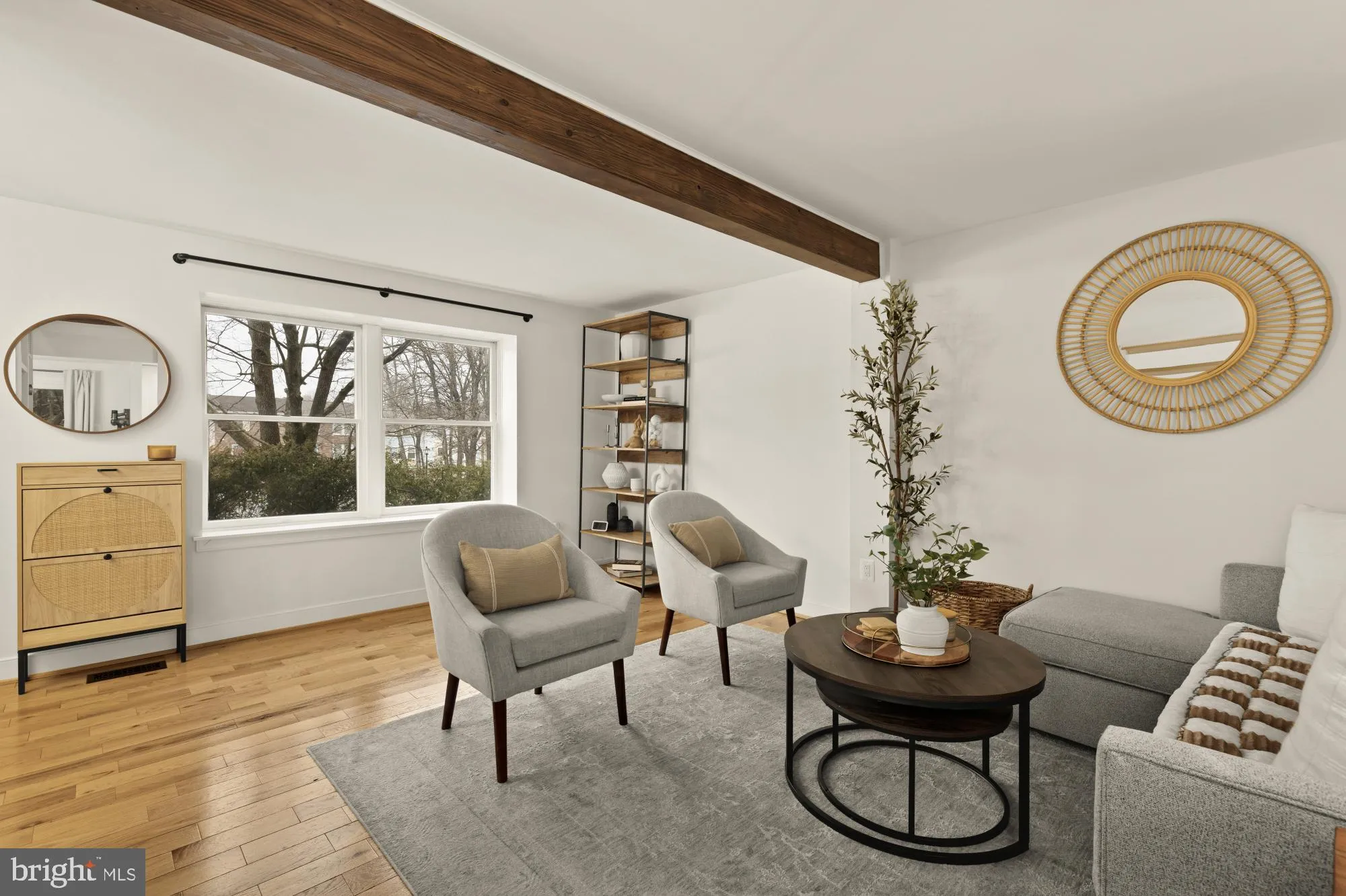 The inviting living area showcases an open yet functional layout, warm hardwood floors, a charming exposed beam, and abundant natural light, creating a comfortable and character-filled space. A convenient half bath is also located on the main level. The designer kitchen is complete with white shaker cabinetry, quartz countertops, sleek appliances, and a spacious island with a built-in microwave—perfect for everyday living and entertaining. The adjoining dining area flows seamlessly and offers a beautiful view of the wooded backyard.
